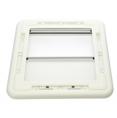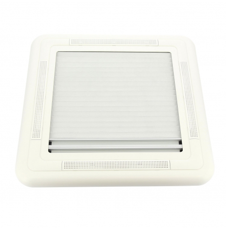 Claraboia com iluminação led, estores mosquiteiros e blackout em cor branca.