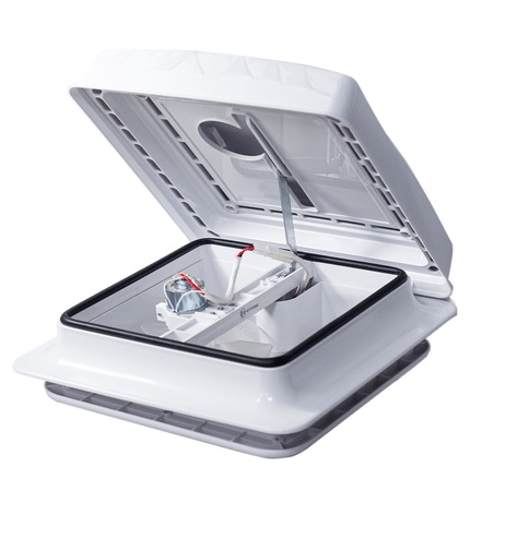 Claraboia com ventilação e iluminação led em cor branca.