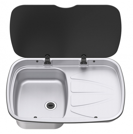 Lava-loiças Thetford, linha Argent, em inox com escorredor e tampa em vidro escuro do lado direito