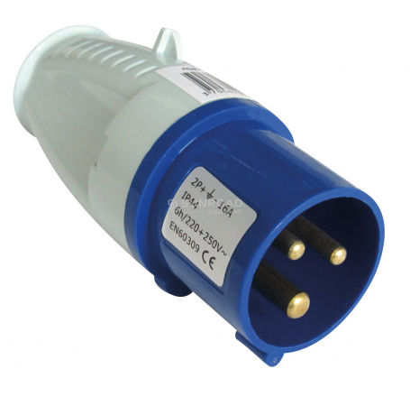 Ficha elétrica industrial azul e branca com três pinos e etiqueta técnica