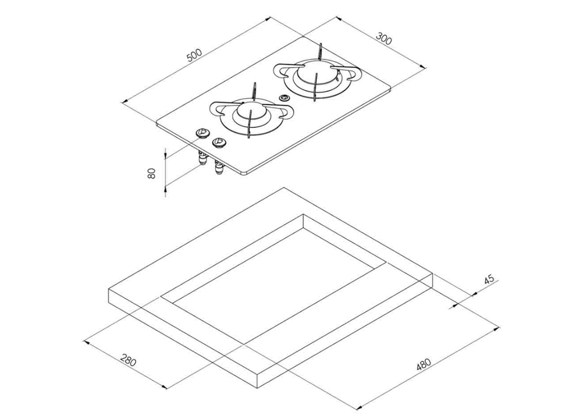 É o fogão de duas bocas com o tamanho mais confortável da gama CAN. ocupando 500 x 300 mm de espaço na bancada.