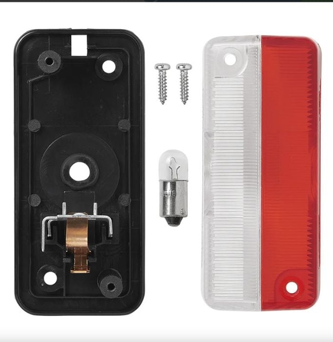 Farol traseiro de veículo com partes branca e vermelha e parafusos