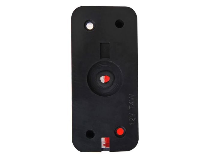 Placa preta de plástico retangular com inscrição 3V 1,2W e detalhes vermelhos