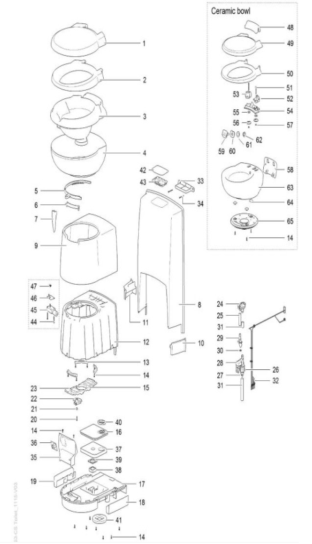 Desenho técnico com peças numeradas de um produto e uma tigela cerâmica desmontada.