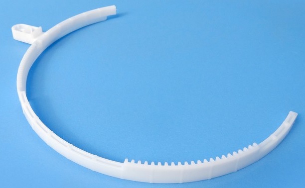 Peça plástica branca semi-circular com dentes pequenos, sobre fundo azul.