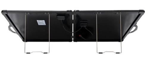 A parte traseira contém pés apoios metálicos para segurar o painel quando estiver desdobrado.