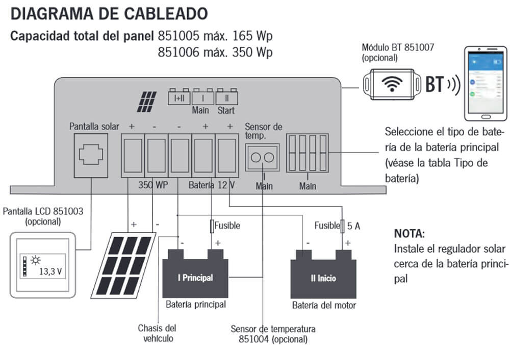 Este regulador dual da Carbest permite carregar duas baterias, pois tem dois pontos de saída de carga. Poderá realizar uma carga automática da bateria principal (MAIN) ou da de arranque (START II). Admite carga normal e carga lenta (máx. 1 A) da bateria de arranque com proteção de sobrecarga.