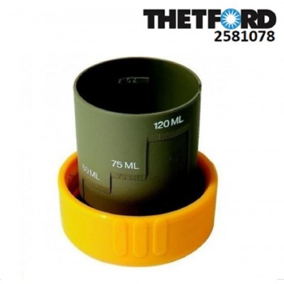 Copo medidor verde com marcações a branco e tampa amarela, texto THETFORD 2581078