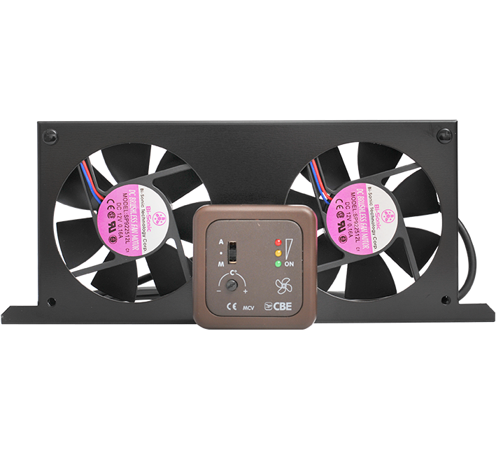 Painel de controlo do ventilador CBE: Dimmer de seleção de temperatura de acionamento; LEDs indicadores de operação e botão comutador de três posições (automático, manual, desligado)